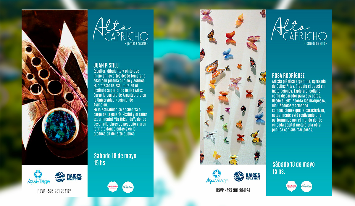 Auspiciado por Aqua Village. Comunicación, Prensa, y Relaciones Públicas. Organizado con la Galeria Imaginario, con los artistas Carolina Iturrospe (Argentina) , Manuel De Francesco (Argentina), Rosa Rodríguez (Argentina) y Juan Pistilli, (Paraguay).